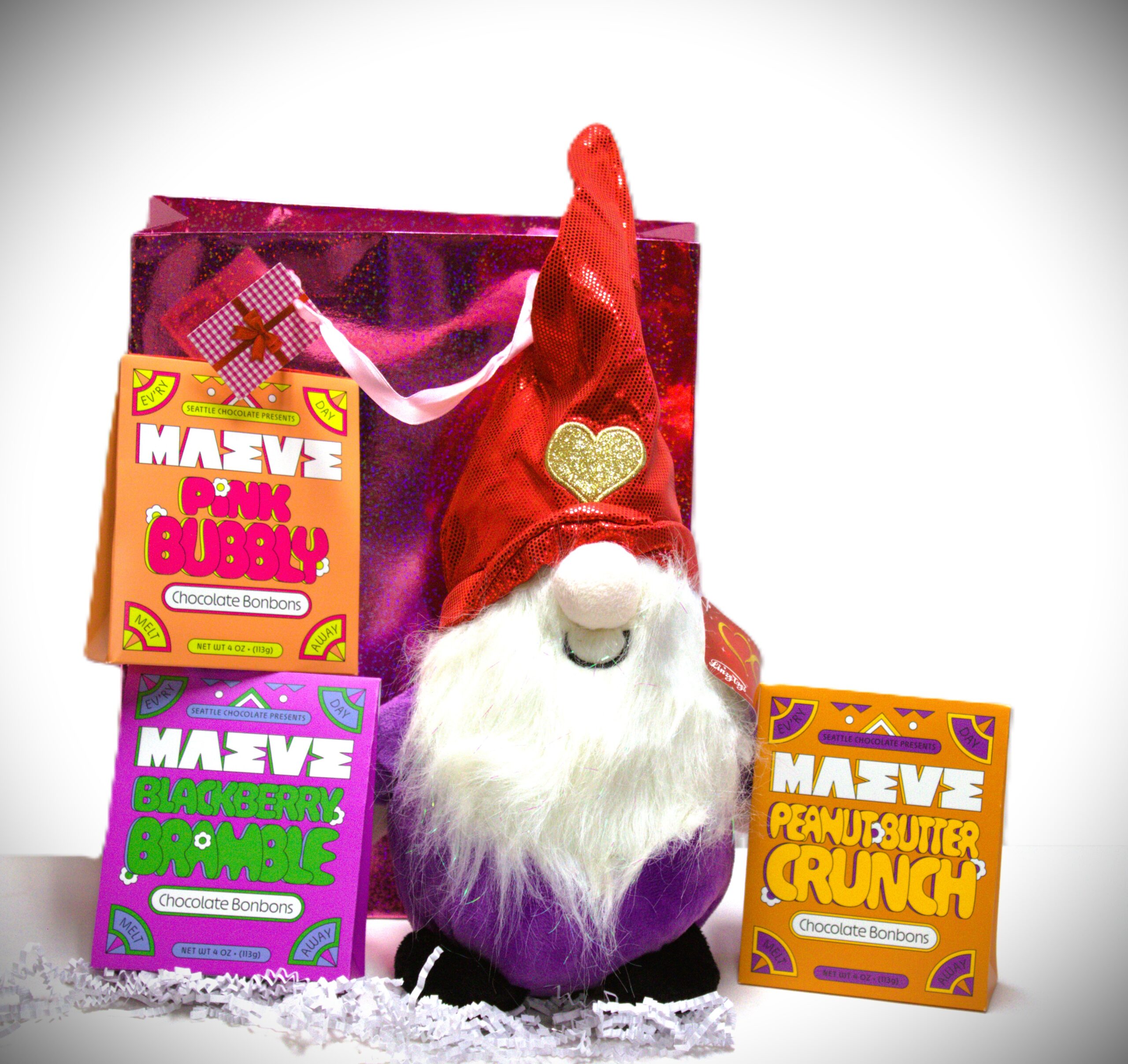 Includes; 11 inch Gnome, Pink Bubbly sparkling bon-bons, Blackberry Bramble bon-bons, Peanut butter Crunch bon-bons, Bright shiny gift bag and plenty of fluffy crinkle paper to stuff in the bag and soften the ride to your home.
