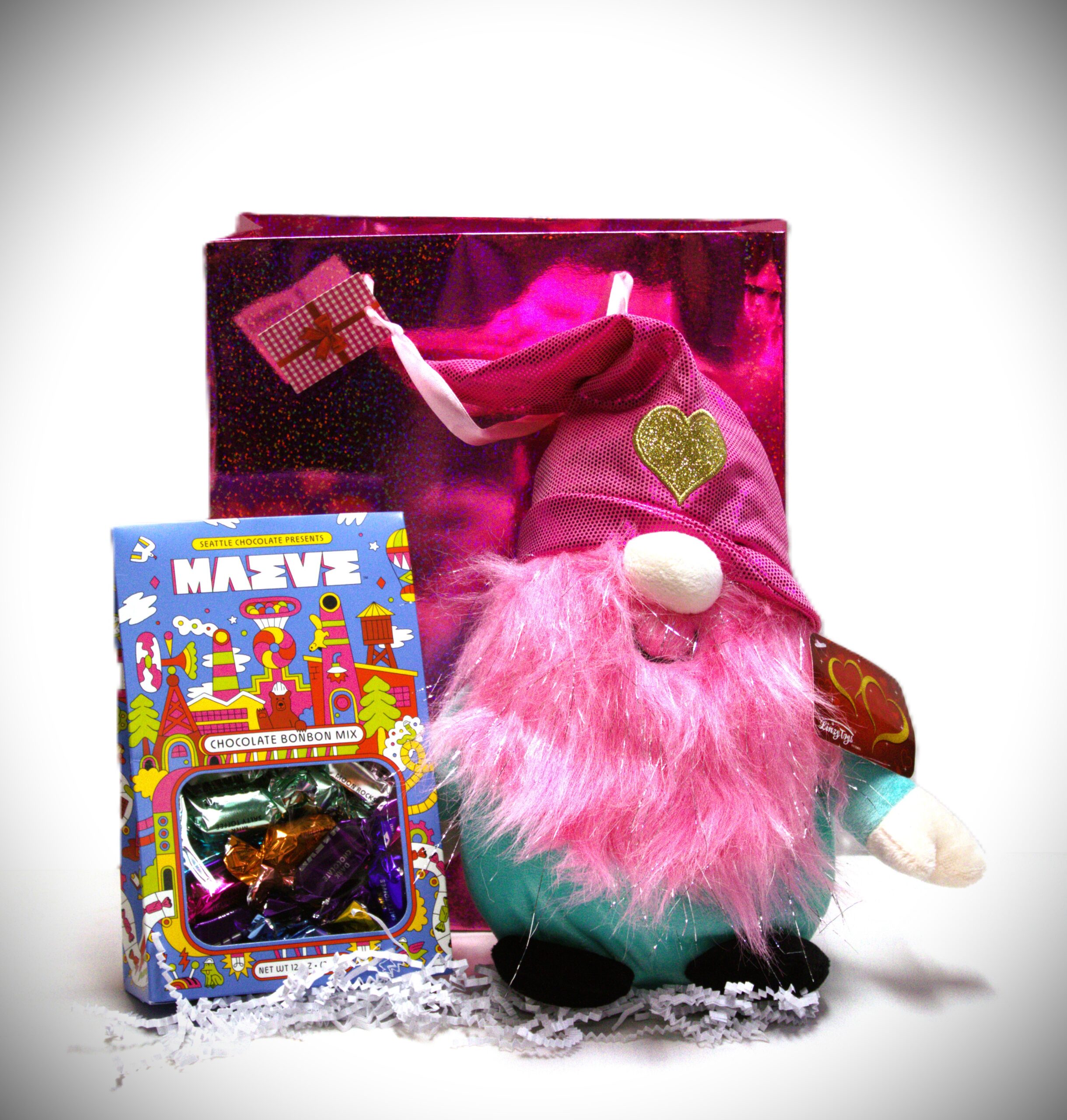 Includes; Sea Choc Maeve Fairytale Factory Bonbon Box (36+- pieces), Eleven inch Gnome, Bright shiny gift bag and plenty of fluffy crinkle paper to stuff in the bag and soften the ride to your home.